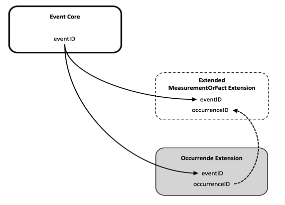 Schematic diagram showing linkages between the Event Core, the Occurrence Extension and the ExtendedMeasurementOrFact Extension. The IPT's enforcement of the star schema is not broken, but the DwC-A capability is extended with an additional link between both extensions for biotic measurements.